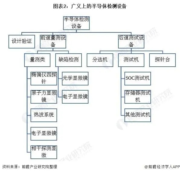 前道检测设备又包括量测类和缺陷检测类,量测类包括椭偏仪四探针、原子力显微镜、热波系统、相干探测显微等,缺陷检测类包括光学显微镜、电子显微镜等;而后道检测设备主要包括分选机、测试机、探针台。