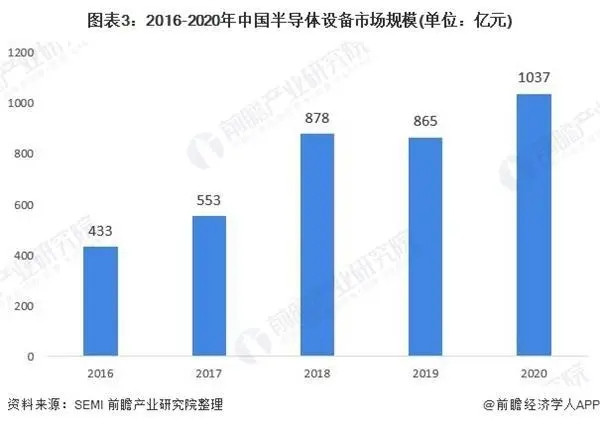 前瞻初步推测,中国半导体设备市场规模在2020年恢复增长,约为155亿美元(约为1037亿元),占到全球半导体设备市场规模的22%左右。